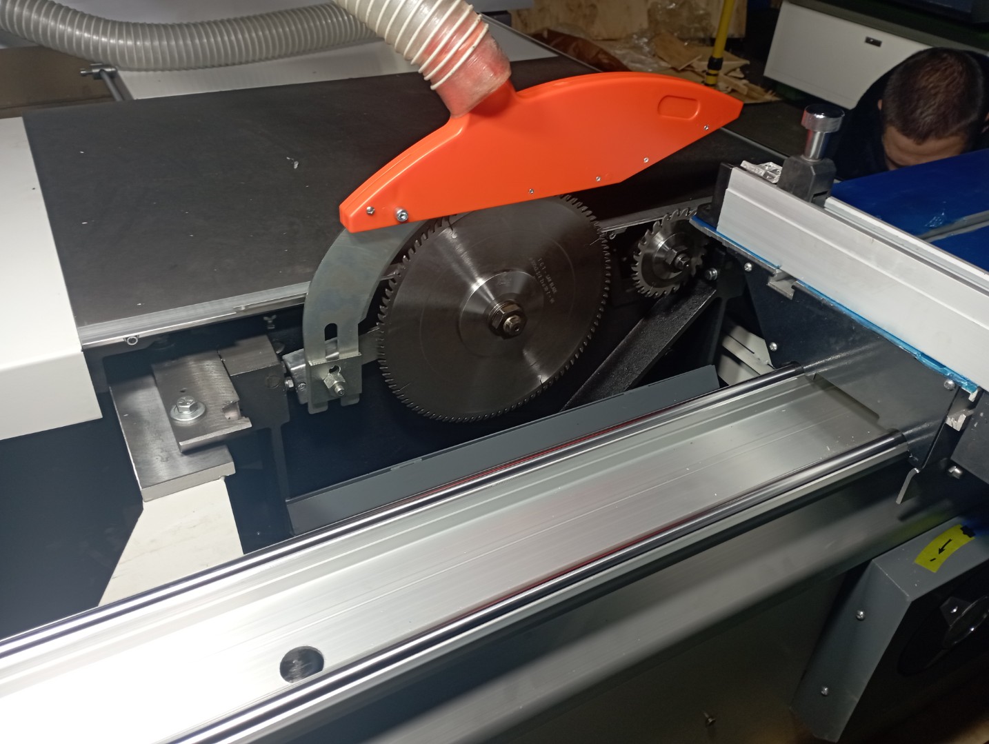 Пильный механизм включает в себя два режущих узла основную пилу и подрезную пилу. Подрезная пила имеет попутное вращения относительно подачи заготовки и за счет предварительного реза позволяет раскраивать ламинированные листы ДСП без появления сколов.